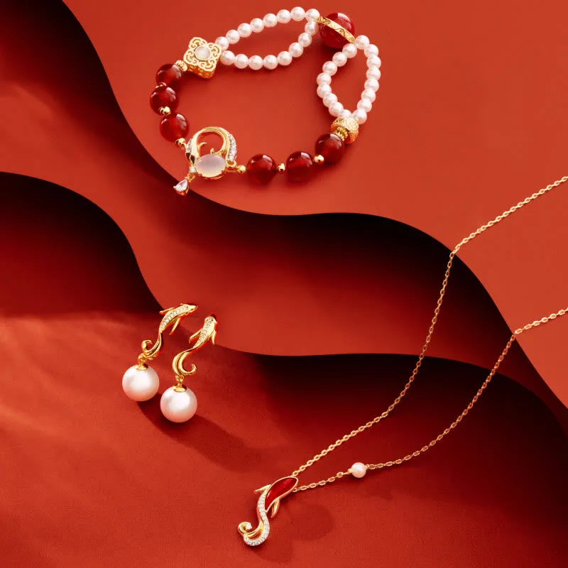 Mythstone -18K Gold Plated Copper Natural Red Agate Pearl Koi Fish Confidence Bracelet Necklace Pendant Earrings Set